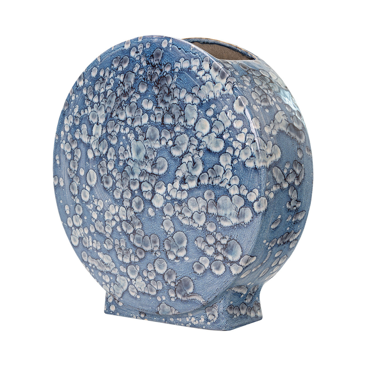 The Aari Vase brings a stunning blend of contemporary artistry and timeless craftsmanship that enhances any space with its distinctive presence. This elegant stoneware creation features a smooth disc-shaped silhouette decorated with captivating bubble-like patterns in contrasting white and gray against a serene blue background. Measuring 20L x 5.5W x 20.5H inches, the Aari Vase provides substantial presence without overwhelming thoughtfully arranged spaces. The smooth surface and rich blue tone complement both modern and traditional decor styles, particularly ideal for coastal and nautical-inspired settings. This decorative accessory serves as a perfect statement piece on console tables, mantels, or display shelves, bringing sophisticated aesthetic and fine detailing to diverse environments.