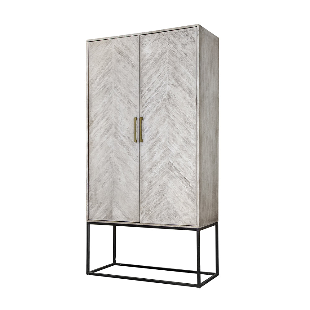 Combining style and function perfectly, this accent cabinet showcases an elegant cream color, a thin iron base, and two doors. Measuring 79H x 40W x 18D, it is ideal for storage but could also be used as a pedestal to display decorative accents on top. The neutral color allows this piece to complement a wide variety of interior styles and decors.