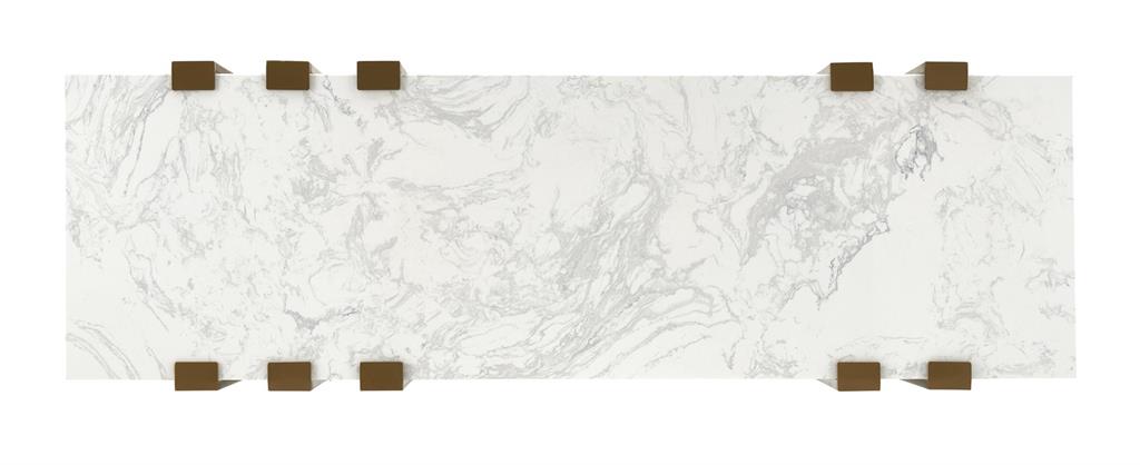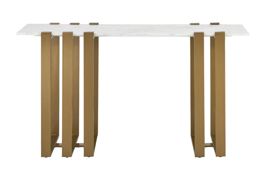 An abstract art lover's dream, this console has an organic beauty, combining a Starshine white marble top and a geometric metal base in a soft gold finish. Every piece is unique due to the natural grey veining throughout the authentic marble tops. Sure to be a conversation piece in any living room.